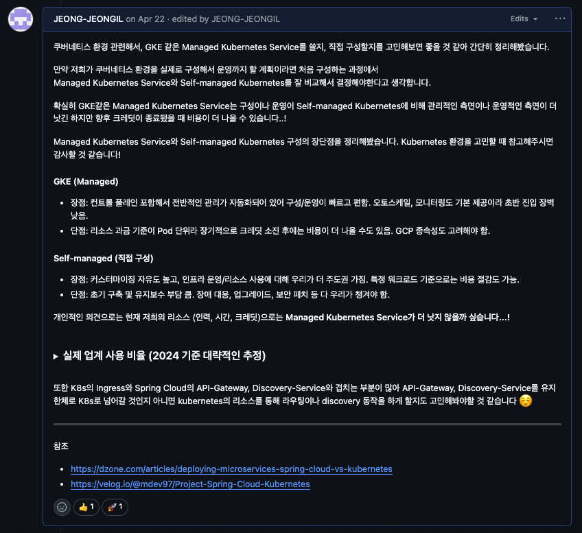 결론적으로 저희 팀의 현재 인력과 시간을 고려했을 때, 초기 구축과 운영 부담이 적고 안정성이 보장되는 Managed Kubernetes가 현실적인 선택이었습니다. 일단 GKE로 쿠버네티스 운영 경험을 충분히 쌓고, 나중에 정말 필요해지면 그때 Self-managed로 넘어가도 늦지 않다고 판단했습니다.