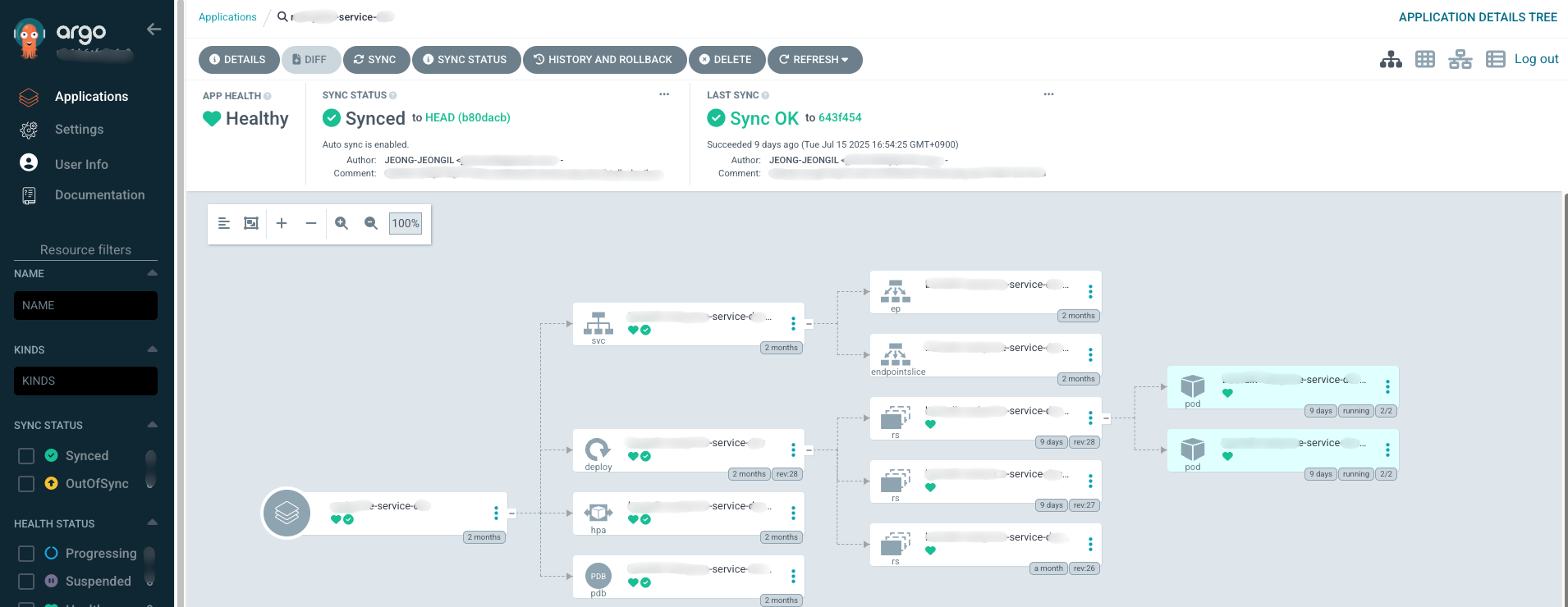 - Rollback의 간편화: ArgoCD는 ReplicaSet을 이용한 Rollback을 지원하기 때문에 특정 버전을 배포했을 때 문제가 있다면 기존에 개발자가 직접 하나하나 처리해줘야 했던 Rollback을 간단하게 할 수 있었습니다. 물론 Rollback할 일이 없는 게 가장 베스트겠지만요 ㅎ..