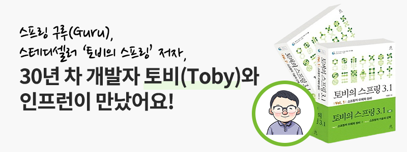 토비님은 스프링을 접하신분들이라면 한번쯤은 들어봤을 “토비의 스프링"의 저자십니다. 요즘은 인프런에서 강의도 올려주시고 계시죠.