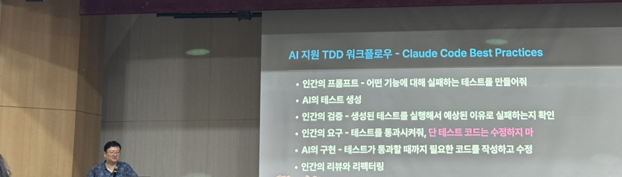 5.2. AI 지원 TDD 워크플로우 (Claude Code Best Practices) 인간이 실패하는 테스트를 만들고, AI가 이를 통과시키는 코드를 구현한 뒤, 인간이 리뷰하고 리팩토링하는 방식의 워크플로우를 보며 TDD가 AI와 얼마나 강력한 시너지를 낼 수 있는지 실감했습니다. 사실 TDD를 완벽하게 실천하지 못하고 있었는데, 이번 기회에 다시 한번 TDD의 중요성을 깨닫고 AI와 함께 TDD를 적극적으로 도입해보려고 합니다.